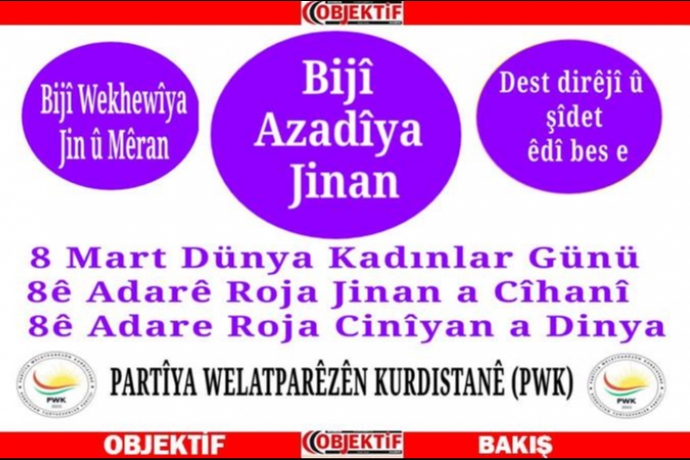 “Kürdistan'a Özgürlük ; kadınlara ve bütün halkımıza da Kürdistan'da özgürlük ” belgisiyle, 8 Mart’ı bir mücadele, birlik ve dayanışma günü olarak anlamlandıralım.