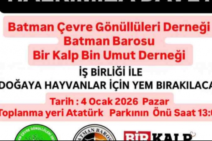 Batman Çevre Gönüllüleri Derneği öncülüğünde, Batman Bir Kalp Bin Umut Derneği ve Batman Barosu’nun destekleriyle pazar günü yaban hayvanları için basın açıklaması ve yem bırakma etkinliği düzenlenecek.