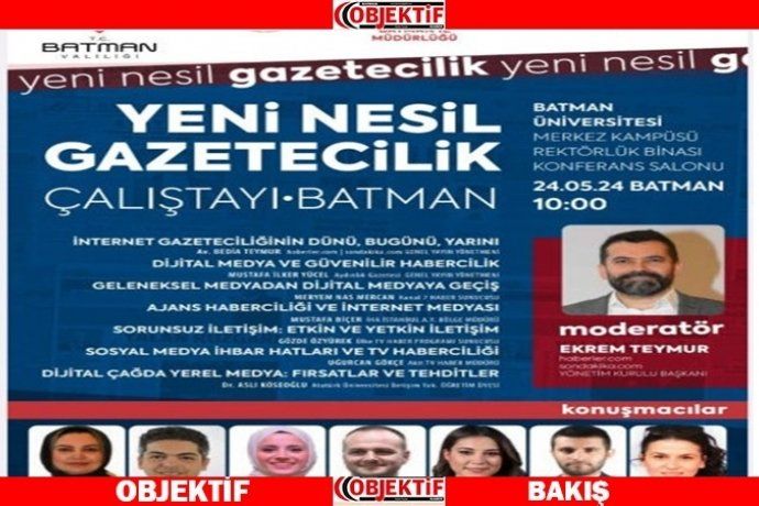 Türkiye İnternet Gazeteciler Derneği (TİGAD)’ne bağlı 81 ilden gazete sahiplerinin de katılacağı programa haberler.com ve sondakika.com Genel Yayın Yönetmeni Av. Bedia Teymur, Aydınlık Gazetesi Genel Yayın Yönetmeni Mustafa İlker Yücel, Kanal 7 Haber Sunucusu Meryem Nas Mercan, İHA İstanbul Bölge Müdürü Mustafa Biçer, Ülke Tv Haber Sunucusu Gözde Özyürek, Akit Tv Haber Müdürü Uğurcan Gökçe ve Atatürk Üniversitesi İletişim Fakültesi Öğr. Üyesi Dr. Aslı Köseoğlu, konuşmacı olarak katılacak. 24 Mayıs cuma günü saat 10.00’da Batman Üniversitesi Merkez Kampüs Rektörlük Binasında gerçekleşecek olan Yeni Nesil Gazetecilik Konferansının moderatörlüğünü ise haberler.com ve sondakika.com haber sitelerinin Yönetim Kurulu Başkanı Ekrem Teymur yapacak.