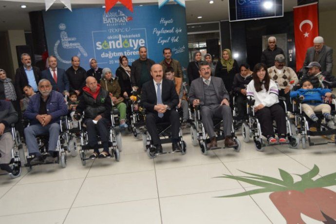 Batman Belediyesi, Kültür Turizm Müdürlüğünde düzenlenen törende 33 engelliye tekerlekli sandalye hediye etti. Sosyal belediyeciliğin gereği olarak, engelli vatandaşlara pek çok hizmeti ayaklarına getirmekten büyük şeref ve onur duyduklarını belirten Vali Canalp, “Down sendromlu evlatlarımız için özel kurslar açtık, engelli sporcularımızı evlerinden alıyoruz, antrenmanlarını yapıyorlar, yine bu evlatlarımızı, vatandaşlarımızı kendi evlerine kadar geri bırakıyoruz. Aşırı yaşlılığından dolayı kendi evlerinde kişisel temizliklerini yapamayan yaşlı engelli bireylerimizin de kendi ev bakımlarını ve temizliklerini de yine devlet olarak biz yapıyoruz. Engelli dostu araçlarımızı da yine engellilerin hizmetlerine sunduk. Ama onların dışında en esaslısı olan nedir derseniz, en esaslı olan şu anda 7 ayrı engel branşında, yani bütün engel branşlarının tamamına hitap edecek şekilde Engelliler Yaşam Merkezimizin inşaatı hızla devam ediyor. Bu merkez bittiği zaman, aynen burada olduğu gibi fiziksel engeli olan vatandaşlarımızın veya görme engelli, işitme engelli vs. aklınıza gelebilecek 7 engelli grubun tamamına hizmet verecek bir merkezimiz olacak” dedi.