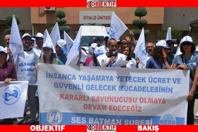 Batman Eğitim ve Araştırma Hastanesi önünde düzenlenen basın açıklamasına Ses Batman Şubesi üyeleri katıldı. Şube eş Başkanı Deniz Topkan’ın okuduğu basın açıklamasında, “Ülkemizdeki var olan sorunların üzerini örterek, gerçekliği ters yüz ederek, sonuçlanan seçimler yerini hızla doların yükselmesine ve sonucunda her şeyin pahalanmasına ve yoksullaşmaya bıraktı. Son 4-5 gündür paramızın değeri hızla düşüyor. Bu düşüş %10'ları geçti. Kamu emekçileri ve emekliler; İktidar ve TÜİK'in yarattığı girdap ile emekçiler karın tokluğu dahi diyemeyeceğimiz bir sefalet ücreti ile yaşamaya mahkûm edilmiştir.