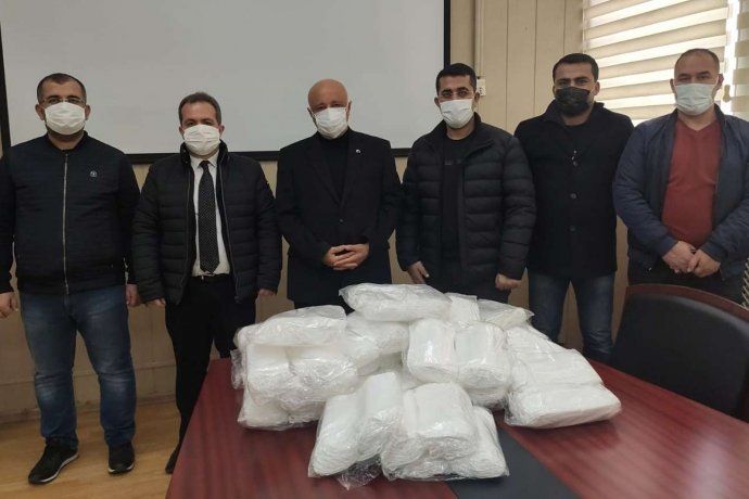 Birlik Başkanı Nurullah Tüzün beraberindeki birlik yöneticileriyle birlikte getirdikleri maskeleri Rektör Durmuş’a teslim etti.