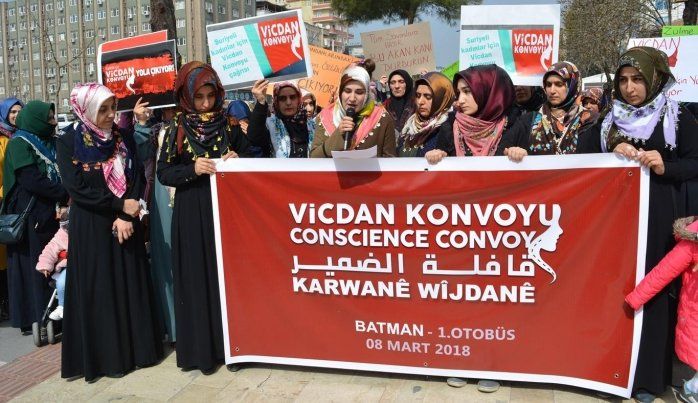 Suriye’de 7 yıldır devam eden savaşta hapsedilen, işkence ve kötü muamele gören kadınlara dikkat çekmek ve özgürlüklerini talep etmek amacıyla Türkiye’deki kadınların öncülüğünde 55 ülkeden oluşturulan ‘Vicdan Konvoyu'na katılmak amacıyla, Batman’dan da bir araç, bu akşam saat 22.00'da Hatay’a doğru yola çıkacak.