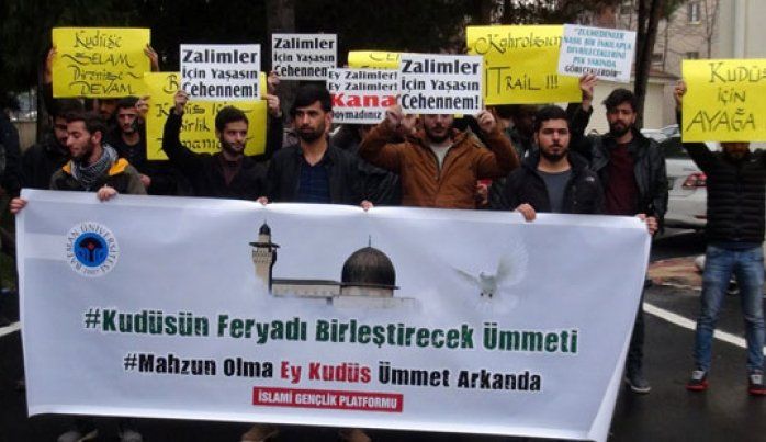Batman Üniversitesi İslami Gençlik Platformu üyesi bir grup öğrenci, ABD Başkanı Donald Trump’un Kudüs’ü İsrail’in başkenti olarak tanıma kararına yürüyüş ve basın açıklaması yaparak tepki gösterdi. Eylemde konuşan Ebubekir Basut, “Ortadoğu’da 22 ülke değişime uğrayacak söylemi, harap olan onca ülkeden sonra 2017’de başkent değiştirme noktasına gelmiştir. Siyonizm taşeronu Trump, Filistin’in Başkenti Kudüs’ü, İsrail’in Başkenti olarak tanıyacaklarına ve Amerika Büyük Elçiliğini Kudüs’e taşıyacaklarına dair açıklamalarda bulunmuştur. Bu çıkış aynı zamanda ABD’nin bu plandaki yerini alenen ayyuka çıkarmaktadır. Bu plan bölgemizi ve insanlığı tehdit eden, Irak’ı parçalayan, Suriyelileri mülteci haline getiren bir ucu Türkiye’ye dayanan Siyonizm planıdır. Kudüs meselesi bu plandan gayri bir mesele değildir. ABD’nin aldığı bu karar sadece Müslümanları ilgilendiren bir karar değil, vicdan sahibi olan her insanı ilgilendiren bir karardır. Biz her zaman söyledik ve söylemeye devam ediyoruz, ABD’nin gölgesinde bir yere varılmaz ve Siyonist İsrail sözden hamasetten değil, ancak güçten anlar. Bütün felsefeleri böl parçala yönet, kullan at olan bir zihniyete devam eden bağlılığımızı biz üniversite gençliği olarak anlamış değiliz” dedi.