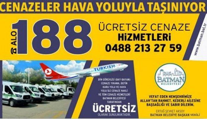 Yaklaşık bir yıldan bu yana uygulamanın devam ettiğini ifade eden Belediye Başkan Vekili Ertuğ Şevket Aksoy, amaçlarının vatandaşlara eldeki olanaklarla en iyi hizmeti sunmak olduğunu ifade etti. Batman’dan başka bir ile nakledilecek cenazeler için ister havayolu ister karayolu olsun taşıma ücretinin Batman Belediyesi tarafından karşılandığını kaydeden Başkan Vekili AKSOY, ‘Alo 188 Ücretsiz Cenaze Hizmetleri’ adı altında hayata geçirilen hizmet için tüm detayların düşünüldüğünü söyledi.