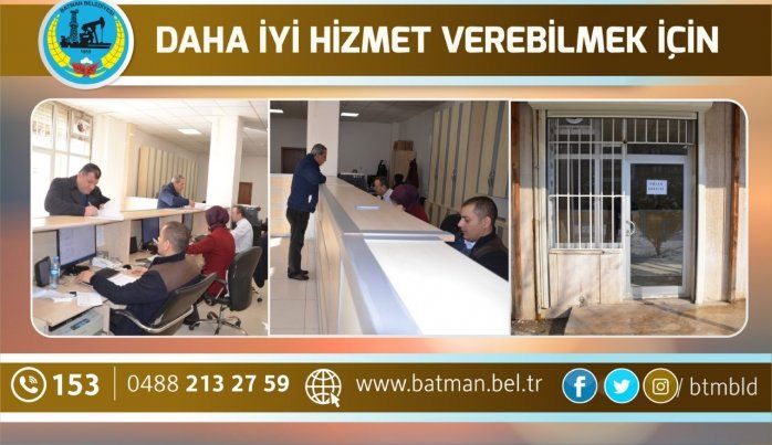 Batman Belediyesi vatandaşa daha iyi hizmet verebilmek için yaptığı çalışmaları sürdürüyor. Belediye Hizmet Binası’nda çalışma başlatan Batman Belediyesi, Emlak Servisi’ni 2. Kattan zemin kata taşıdı. Su tahsilat bürosunun yan tarafına taşınan Emlak Servisi halkın daha kolay ulaşabilmesi için zemin katta hizmet sunmaya devam edecek.