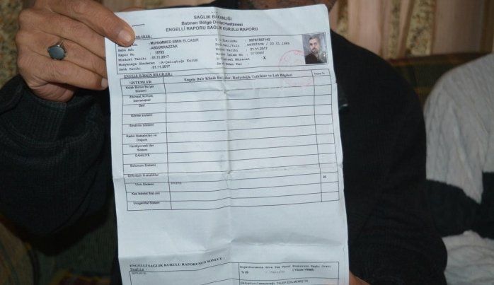 Suriye'nin Deyrizor kentinden kaçarak eşi ve 5 çocuğuyla birlikte birkaç yıldır Batman'a sığınan Abdurrezzak Casır, 32 yaşındaki epilepsi hastası olan oğlunun akli yaşının 4 yaşındaki bir çocuğa denk olduğunu, bu nedenle çocukları için rapor istediler. Eşi ve çocuklarıyla birlikte Meydan Mahallesi 1119 Sokak'ta kiralık bir evde oturan Casır, ayda yaklaşık 500 TL kira, elektrik ve su borcunu yatırdıklarını belirtti. Hayatlarını zor şartlarda sürdürdüklerini belirten Casır, tek isteklerinin epilepsi hastası ve zihinsel engelli çocuğuna rapor verilmesi ve maaşa bağlanması olduğunu ifade etti. Maddi gücünün olmadığını ve kıt kanaat geçimlerini sağladıklarını dile getiren Casır, "Suriye savaşından kaçarak Türkiye'nin Batman şehrine yerleştik. 32 yaşındaki epilepsi hastası ve zihinsel engelli oğlum Muhammed Emin Casır çocuk gibidir. Ben 65 yaşındayım. Buraların yabancısıyız. Ne Türkçe ne de Kürtçe bilmediğim için çok zorlanıyorum. İş olmadığı için çalışamıyorum. Elektronik işinden anlarım. Yetkili birileri bana iş imkânı sağlasaydı çalışacaktım. Oğlumun hastalığına rapor çıkarmak için Batman Bölge Devlet Hastanesine götürdüm. Hastanede sözde bir heyet oğlumu muayene etti ancak raporda 8 doktorun imzası var. Sadece bir kişi oğlumu muayene etti. Yüzde 90 oranında rapor verilmesini beklerken yüzde 20 rapor vererek hiçbir haktan yararlanamıyoruz." dedi. Hasta oğluna tam raporun verilmesi gerektiğini söyleyen Casır, "Oğlumu bir daha hastaneye götürüp raporunu düzeltmelerini istiyorum. Oğlumun bu raporu olmadığı için hiçbir haktan yararlanamıyoruz. Geldiğimizden beri doğru düzgün yardım almadığımız için ailece perişan haldeyiz. Bu şekilde bir hasta Batmanlı olsa hasta maaşı ve bakım maaşı verilecek. Bizlere de bu hakların verilmesini istiyoruz. Sosyal Yardımlaşmaya gittim. Derdimi anlattım, beni dinleyen olmadı. Bana 'git, git Suriyeli git.' dediler." ifadelerini kullandı.
