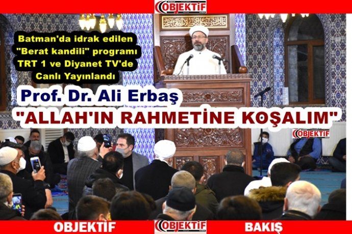 Diyanet İşleri Başkanı Prof. Dr. Ali Erbaş, Din Hizmetleri Genel Müdürlüğünce Batman’da düzenlenen ve Diyanet TV ile TRT1 ekranlarından yayınlanan ‘Berat Gecesi Özel Programı’na katıldı. Mehmet Emin Terece Camisinde gerçekleşen programda konuşan Prof. Dr. Erbaş; “Bu mübarek gün ve gecelerde bir nefis eğitimine kendimizi tabii tutmamız gerekiyor. Hep birlikte berata ulaşalım inşallah” dedi.