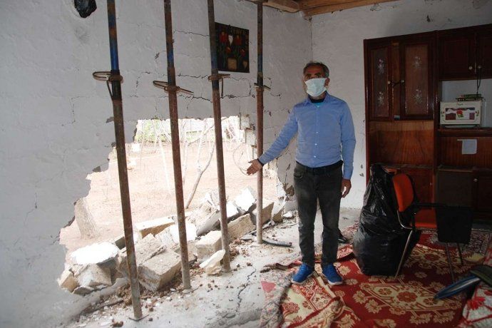 Çay Mahallesi 2128 Sokakta bulunan iki odalı kerpiç evde oturan 5 çocuklu Ay ailesi, evlerinin bir bölümünün yıkılmasıyla büyük bir mağduriyet yaşadı. Ay ailesi, evlerinin çökmemesi için tavana demirlerle destek sağladığı görüldü.