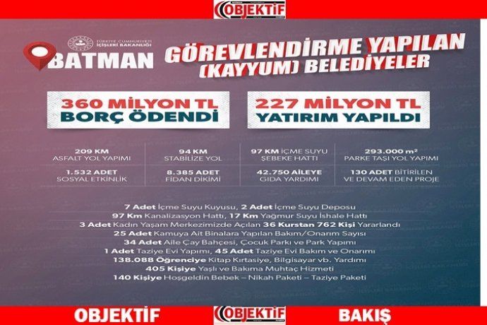 209 Km asfalt yol yapımı, 94 stabilize yol, 97 km içme suyu şebeke hattı, 293 bin metrekare parke taşı yo yapımı, 1532 adet sosyal etkinlik, 8385 adet fidan dikimi, 42 bin 750 aileye gıda yardımı, 130 adet bitirilen ve devam eden projenin olduğunu açıklayan İçişleri Bakanlığı resmi sosyal medya hesaplarında Batman Belediyesini örnek gösterdi.