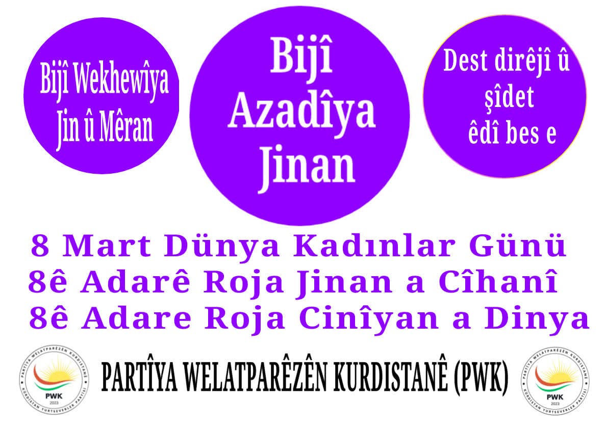“Kürdistan'a Özgürlük ; kadınlara ve bütün halkımıza da Kürdistan'da özgürlük ” belgisiyle, 8 Mart’ı bir mücadele, birlik ve dayanışma günü olarak anlamlandıralım.