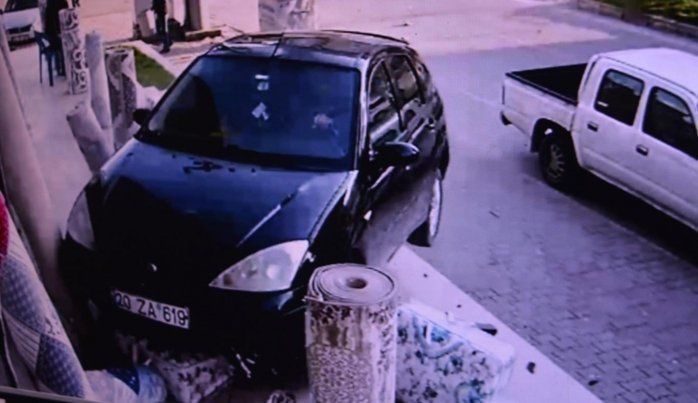 Kaza anı ise otomobilin girdiği dükkan ve Barış Bulvarı'ndaki bir iş yerinin güvenlik kameralarına yansıdı. Görüntülerde motosikletin otomobilin arkasına çarptıktan sonra motosikletteki 2 kişinin yerlere savrulduğu görülüyor. Motosikletin otomobilin arka tamponuna çarpmasıyla direksiyon hakimiyetini kaybeden sürüsü kaza yerinde bulunan 10 basamak merdiveni çıktıktan sonra bir halıcı dükkanına girdiği ve geri geri çıktığı görülüyor.