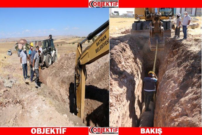 Sıcak ve kavurucu havaya rağmen özverili bir şekilde çalışan BASKİ ekipleri, kanalizasyon altyapı boru hattı için 400’lük beton boru döşüyor.