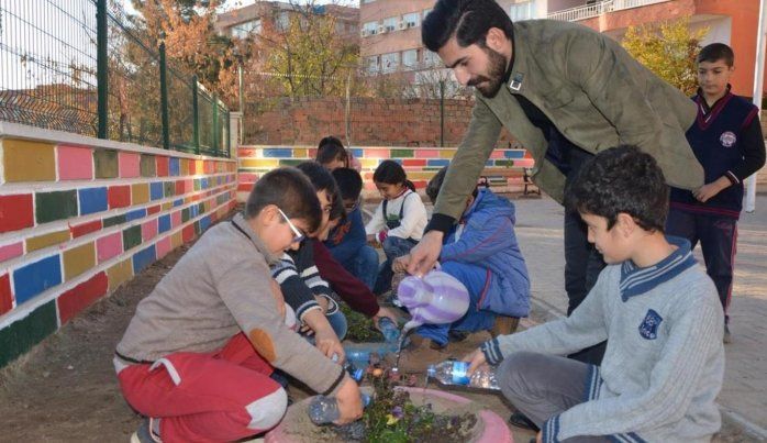 Din kültürü ve ahlak bilgisi öğretmeni Murat Işık, öğrencileriyle birlikte okul bahçesini çeşitli renklere büründürüp, toprak alana ağaç ve çim ekiyor.