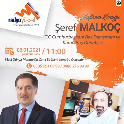 Cumhurbaşkanı Danışmanı ve Başdenetçi Şeref MALKOÇ " RADYO YÜKSEL"in canlı yayın konuğu olacak.