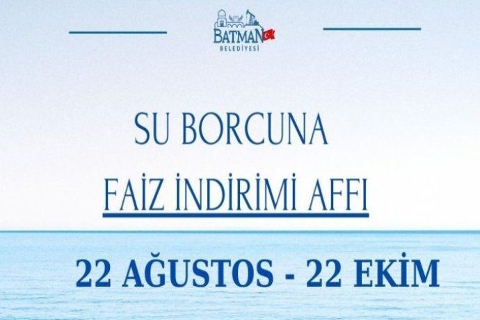 Ağustos ayında yapılan olağan meclis toplantısında alınan kararla, su borçlarında geçerli olacak faiz indirimi uygulaması 22 Ağustos 2024 tarihinden itibaren iki ay süresince devam edecek. Bu sürede aboneler, borçlarının faizini yüzde 90 indirimle ödeme imkânı bulacak. Batman Belediye Meclisi’nde alınan kararı ilişkin Belediye Eşbaşkanları Gülistan Sönük ve Yeşil Işık yaptıkları açıklamada, su borçlarını ödeyemeyen abonelerin borçlarının gecikme zammı affı, uygulamaya geçilebileceği tarihten itibaren 2 (iki) ay süreyle uygulanmasına ve talep olması halinde 1 (bir) ay daha uzatılabileceklerini dile getirdi. Batman Belediyesi bu düzenleme ile, yurttaşların su borçlarını ödemelerini kolaylaştırarak ekonomik yüklerini hafifletmeyi amaçlıyor.