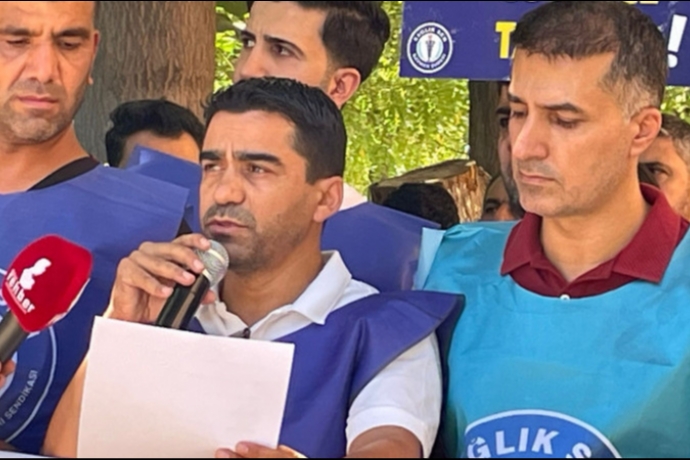 Batman Eğitim ve Araştırma Hastanesi İdari Bina önünde toplanan Sağlık-Sen Batman Şubesi, 8. Dönem Toplu Sözleşme görüşmelerinde kamu işvereninin sunduğu zam teklifini “yetersiz” buldu.