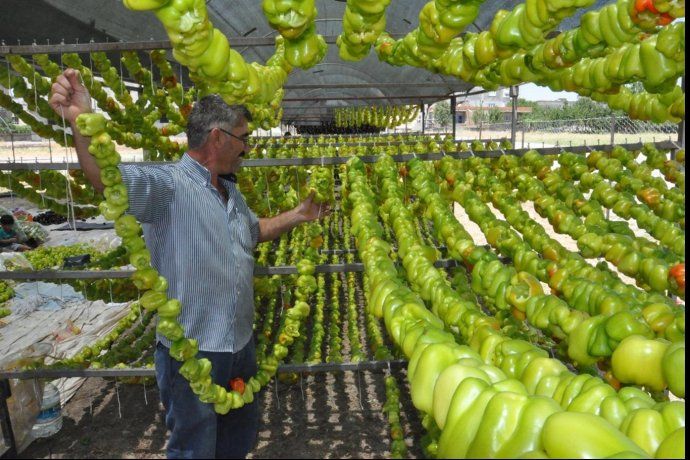 Bir müddet suda bekletilen sebzeler, daha sonra güneş gören boş arazilerde hazırlanan askılara kurutulmak üzere bırakılıyor. Askılarda adeta görsel bir şölen oluşturan kurutmalıklar burada günlerce kavurucu güneşin altında bırakılıyor.
